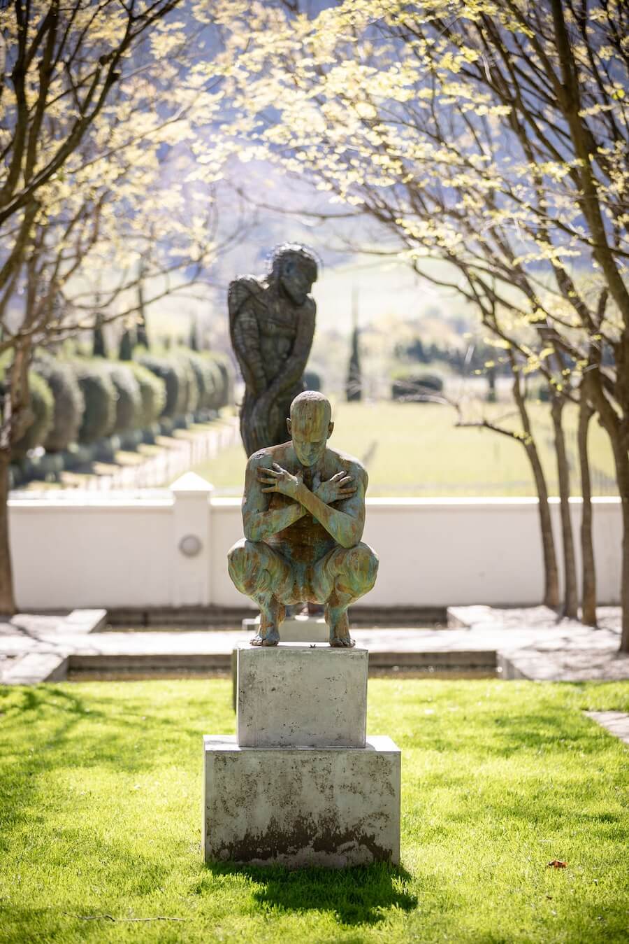 Art also extends across the estate itself. Sculptures are placed throughout the grounds, allowing visitors to wander among artworks set against the backdrop of vineyards and mountains.