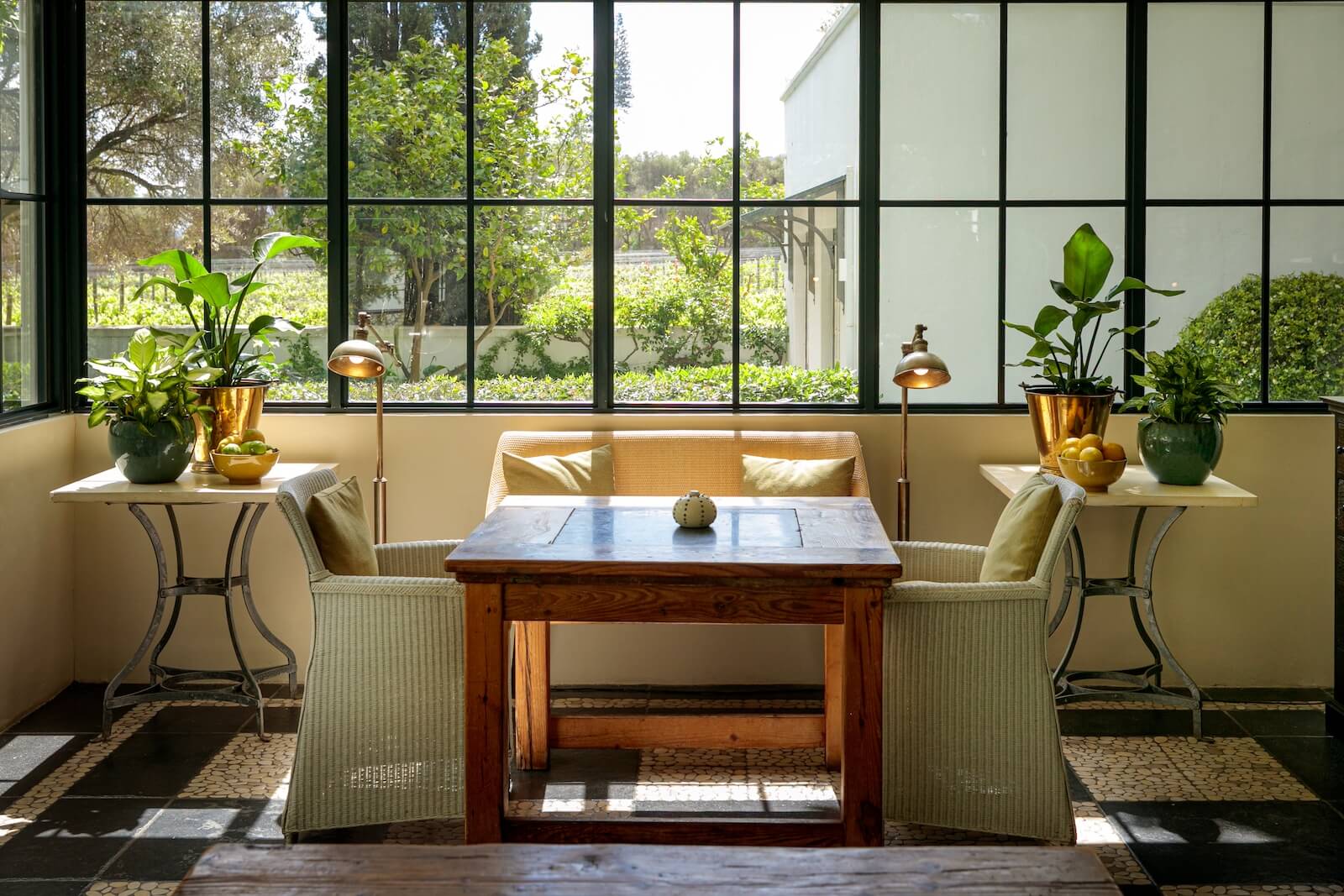 Guests can dine indoors or outside beneath the oak tree, enjoying views of the gardens and vineyards while experiencing dishes designed to complement the estate’s wines.